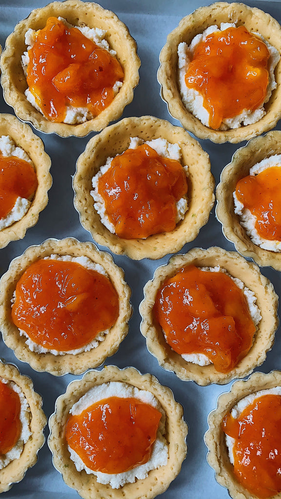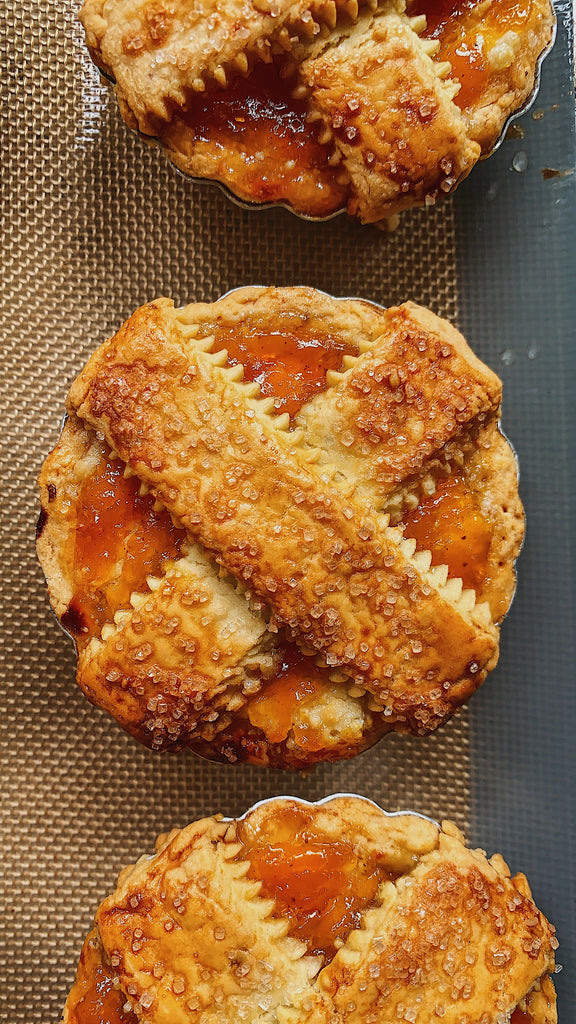 Box of 2 mini Italian style rustic pies (3-inch). Choose between Lemon Curd (cannot be eggless), Strawberry curd (seasonal and contains egg), spiced apple or a traditional ricotta and homemade seasonal fruit jam filling. Get a combo box and specify your choice in notes on checkout. You can also get in touch with us to make 8 inch pies for the same.