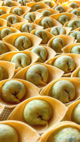 Filled pasta stuffed with fresh winter peas, mascarpone, ricotta, Parmesan, garlic, lemon and mint