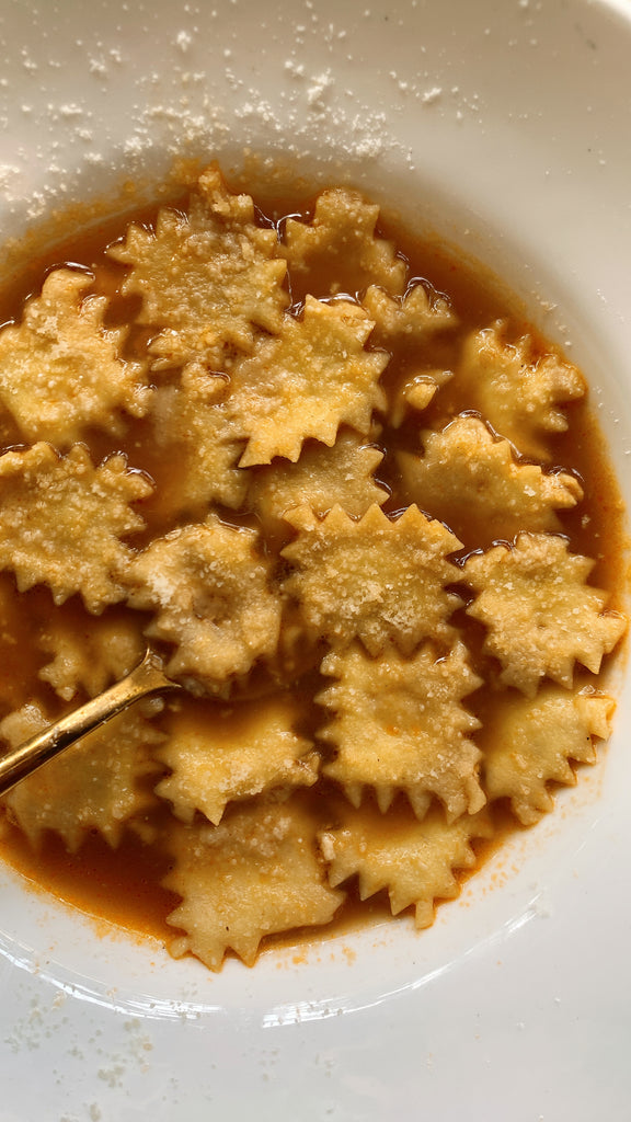 Sfoglia Lorda (or Spoja Lorda) are a traditional Romagna homemade pasta that are prepared by spreading a thin layer of ricotta filling on hand rolled sfoglia which are then cut into tiny little squares that are best enjoyed in a nice broth! We have prepared a porcini broth for these. Each serving comes with the pasta squares and broth.